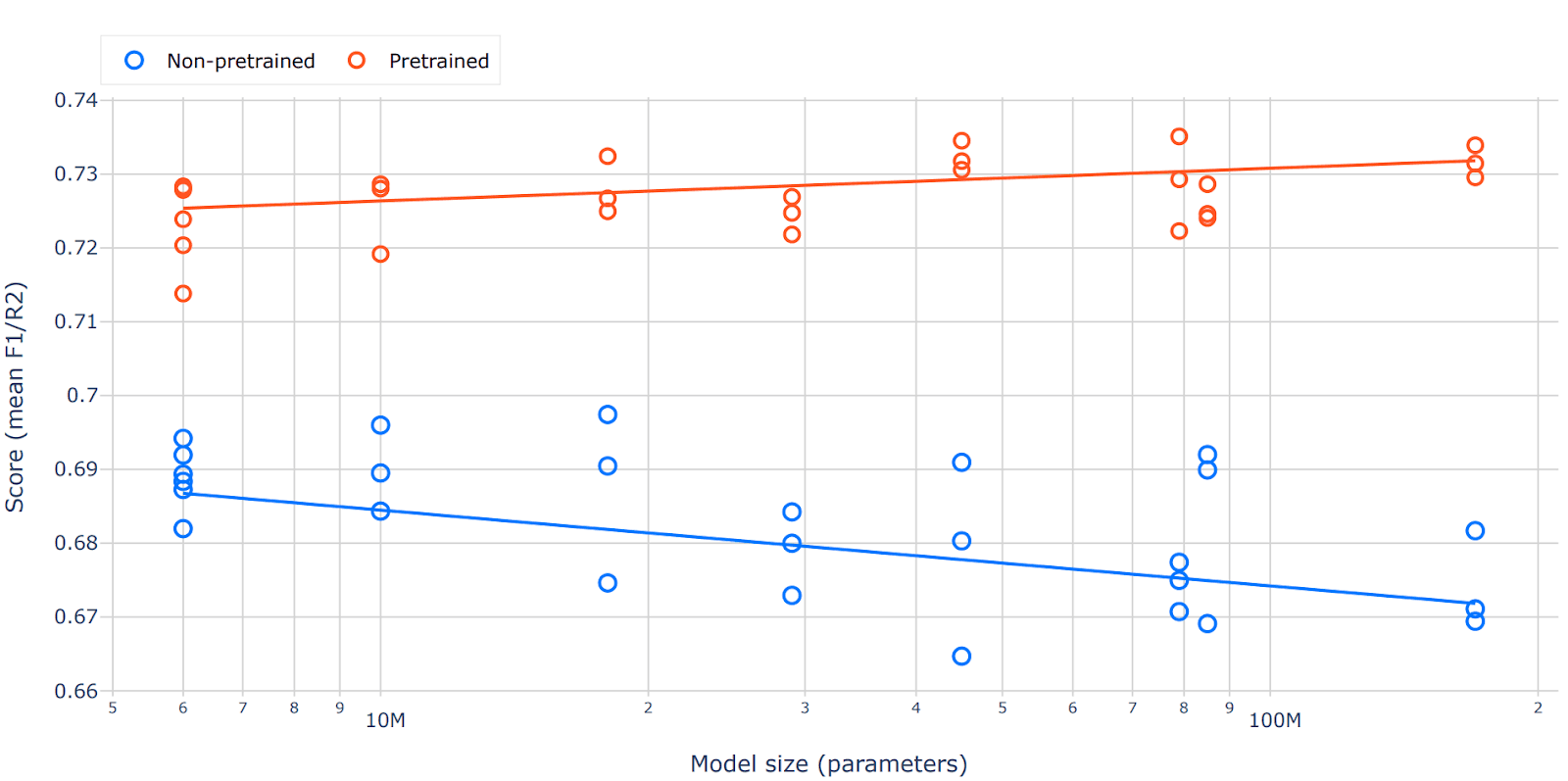 Figure 4. Benchmark performance as a function of model size for pretrained and non-pretrained transformer models. Each point represents the score from an individual replicate across tasks, with lines indicating linear trends. Pretrained models show consistent improvements with increasing parameter count, while non-pretrained models exhibit a decline in performance at larger scales, highlighting the importance of pretraining for effective model scaling.