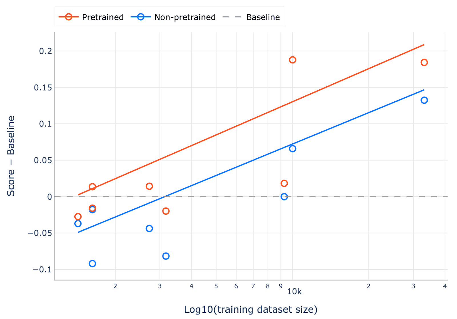 Figure 3. The difference in mean score across the three replicates relative to the RF baseline, plotted against the size of the training dataset for each task. At 10k and above, all pretrained transformers are better than the baseline. Solid lines are OLS lines of best fit.
