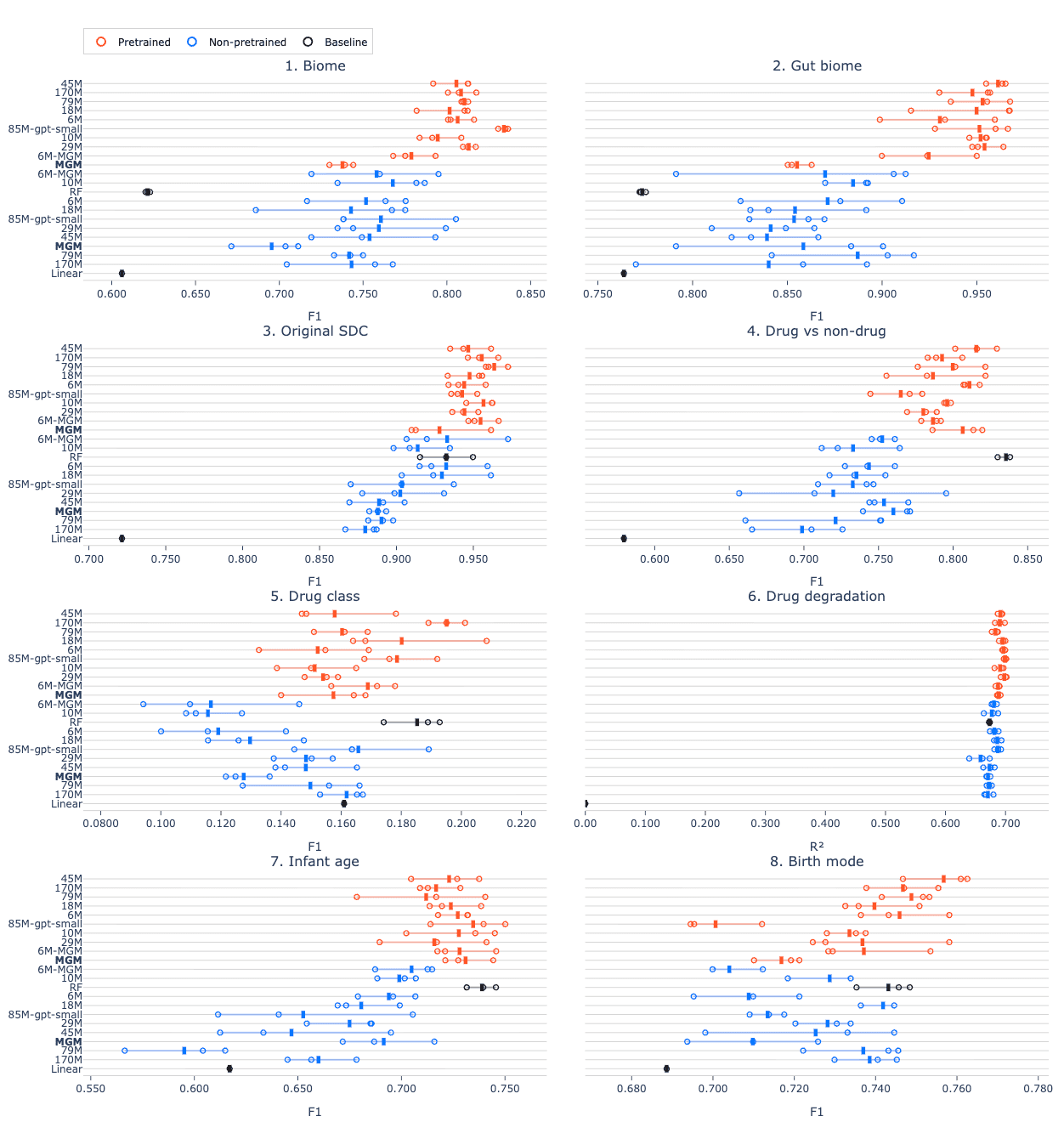 When we break down the results for each benchmarking task, we find that pretraining consistently improves performance, though the degree of improvement varies by task (Figure 2). This reinforces a key point: self-supervised pretraining is an effective way to learn general-purpose microbiome representations that transfer well across a wide range of downstream tasks. Additionally, we see that for benchmarking task 4 (drug treatment) and task 7 (infant age), simpler baseline models still outperform all transformer-based approaches. Thus, for small datasets, the added complexity of transformers does not necessarily improve performance.