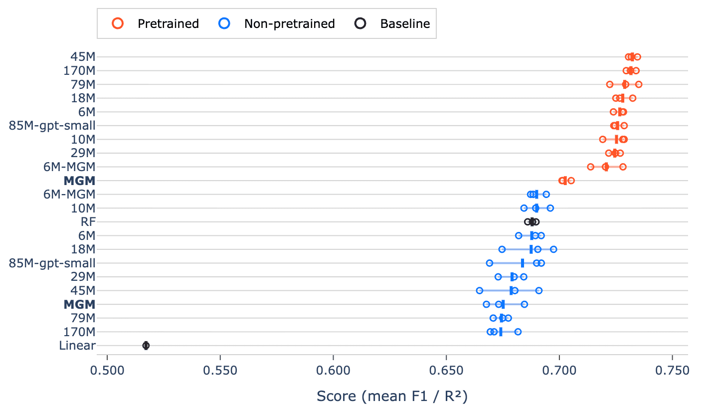 We also compared our models to MGM (Ref. 8), an existing microbiome foundation model trained on 260,000 MGnify samples using the same GPT-2 architecture. To provide an apples-to-apples comparison between our larger pretraining corpus and prior work, we included the 6M-MGM model architecture, which exactly matched the MGM model. Although we aimed to include other recent microbiome foundation models (Ref. 10, 11) the lack of publicly available weights made this impossible. Finally, to assess the effect of pretraining itself, we tested versions of each transformer architecture with randomly initialized weights.